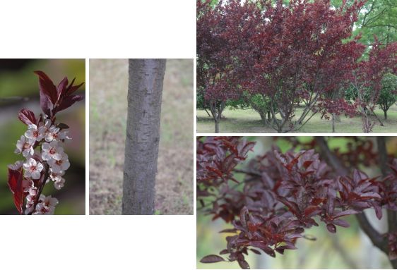 【识别要点】落叶灌木或小乔木,高可达2.5m左右,枝条幼时紫褐色,老枝有皮孔,叶片长卵形或卵状长椭圆形,叶面红色或紫色,背面色彩更红,花单生,中等偏小,淡粉红色,花微香,4-5月开花。