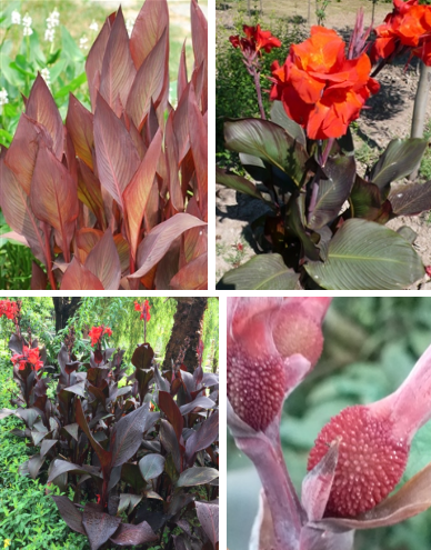 【识别要点】多年生草本植物。株高1m左右,茎叶均紫褐色,总苞褐色,花萼及花瓣均紫红色,瓣化瓣深紫红色,唇瓣鲜红色。美人蕉的果实为略似球形的蒴果,有瘤状突起,种子黑色,坚硬。其他同美人蕉。
