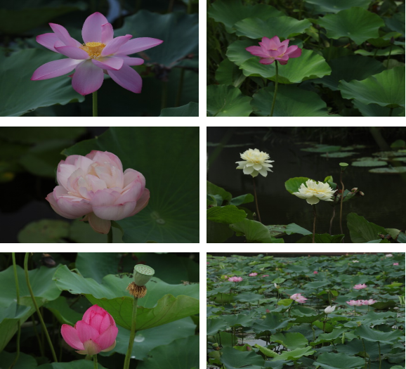 【识别要点】多年生挺水植物。根状茎(藕)肥厚多节,节间内有多数孔眼。叶盾状圆形,上被蜡质,蓝绿色,有带刺长叶柄挺出水面。花大,单生于花梗顶端,高于叶面,粉红、红 或白色,花清香,昼开夜合,花期6-8月。花托于果期膨大凸出于花中央,有多数蜂窝孔,内有小坚果(莲子),果熟期8-9月。品种较多,主要分观赏及食用两大类。观赏类又有单瓣、重瓣以及各种花色、花型的品种。依应用不同可分为藕莲、子莲和花莲三大系统。