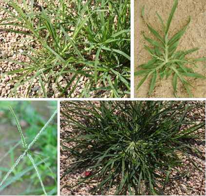 【识别要点】一年生草本。根系极发达。秆丛生,基部倾斜。叶鞘两侧压扁而具脊,松弛,无毛或疏生疣毛;叶舌长约1mm;叶片平展,线形,无毛或上面被疣基柔毛。穗状花序2-7个指状着生于秆顶,很少单生;小穗含3-6小花;颖披针形,具脊,脊粗糙。囊果卵形,基部下凹,具明显的波状皱纹。鳞被2,折叠,具5脉。花果期6-10月。