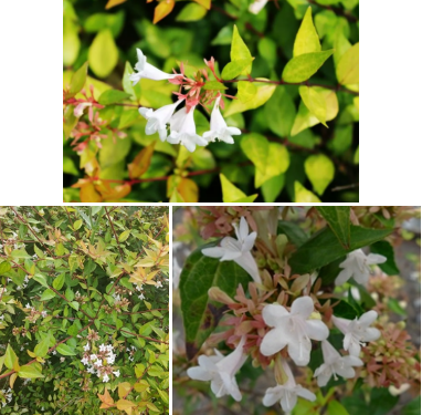 【识别要点】是糯米条与单花六道木的杂交种。常绿灌木,可达1.5m。叶小,长卵形,边缘具疏浅齿,在阳光下呈金黄色,光照不足则叶色转绿。圆锥状聚伞花序,花小,白色带粉,繁茂而芬芳,花期6-11月。