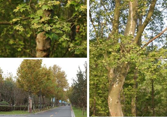【识别要点】落叶乔木,树冠广卵圆形。树皮灰绿色,裂成不规则的大块状脱落, 内皮淡黄白色。嫩枝密生星状毛。叶基心形或截形,裂片三角状卵形,中部裂片长宽近相等。果序常2个生于总柄,花柱刺状。花期4-5月,果熟期9-10月。