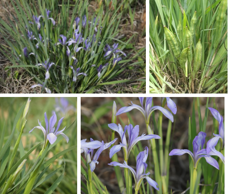 【识别要点】多年生草本,根茎植短,须根细而坚硬,叶丛生,狭线形,基部具纤维状老叶销,叶下部带紫色,质地较硬。花亭与叶等高,着花1-3朵,花被片6枚,蓝色,外轮垂瓣稍大,中部有黄色条纹,内轮,旗瓣直立,花柱3歧呈花瓣状,端2裂,花期4号月。