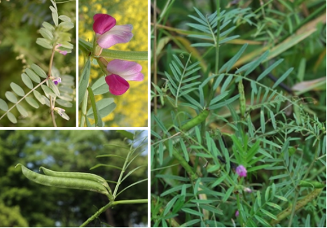 【识别要点】一年生或二年生草本植物,茎多分支,偶数羽状复叶,叶轴顶端卷须发达;小叶片线形或线状长圆形,叶脉不甚明显,两面被浅黄色疏柔毛。花腋生,有小苞叶;花萼钟形,花冠红色或紫红色,荚果长线形,种皮黑褐色,革质,肿脐线形,3-6月开花,5-9月结果。