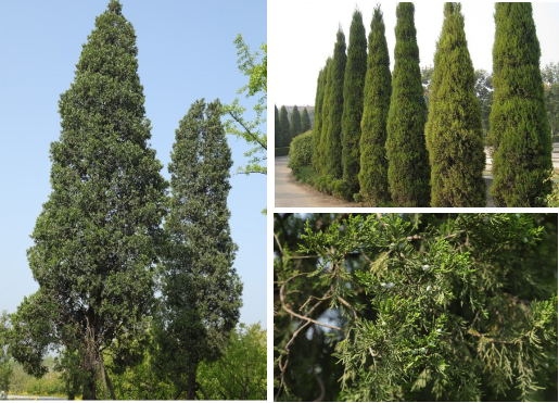 【识别要点】是圆柏的栽培品种,常绿直立乔木;树冠幼时为锥状,大树则为尖塔形,树皮深灰色,叶多为刺形,二型;叶片近披针形,先端微渐尖,三叶交叉轮生,斜展,疏松,披针形,先端渐尖,绿色中脉两侧有两条白粉带。雌雄异株,球果近球形。