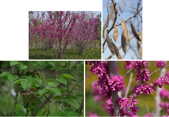 【识别要点】落叶丛生或单生灌木,高2-5m;树皮和小枝灰白色。叶纸质,近圆形或三角状圆形,花紫红色或粉红色,2-10余朵成束,荚果扁狭长形,绿色,种子2-6颗,阔长圆形,黑褐色,光亮。花期3-4月;果期8-10月。