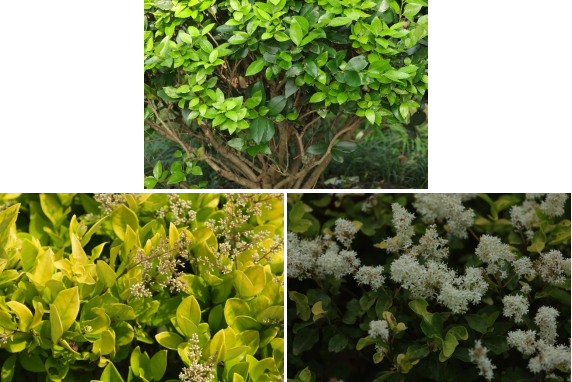 【识别要点】常绿灌木或小乔木。植株高1.2m以下,枝叶稠密;叶对生,单叶卵形,革质、厚实、有肉感。春季新叶鲜黄色,冬季转成金黄色,色彩悦目。圆锥状花序,花白色。果实椭圆形,呈紫黑色。花期6-7月,果期10-11月。