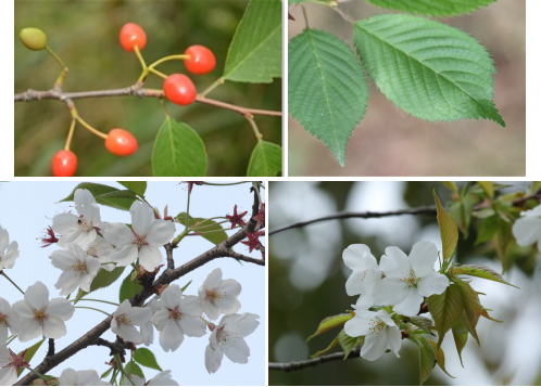 【识别要点】落叶乔木,高3-8m,树皮灰褐色或灰黑色。小枝灰白色或淡褐色,无毛。冬芽卵圆形,无毛。叶片卵状椭圆形或倒卵椭圆形,上面深绿色,无毛,下面淡绿色,无毛。花序伞房总状或近伞形,有花2-3朵;总苞片褐红色,倒卵长圆形;花瓣白色,稀粉红色,倒卵形,先端下凹。核果球形或卵球形,紫黑色。花期4-5月,果期6-7月。