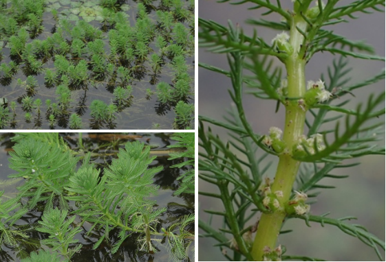 【识别要点】多年生粗壮沉水草本。根状茎发达,在水底泥中蔓延,节部生根。叶通常4片轮生,或3-5片轮生,水中叶较长,丝状全裂,无叶柄,水上叶互生,披针形,较强壮,鲜绿色,裂片较宽。秋季于叶腋中生出棍棒状冬芽而越冬。花单性,雌雄同株或杂性、单生于水上叶腋内,果实广卵形。