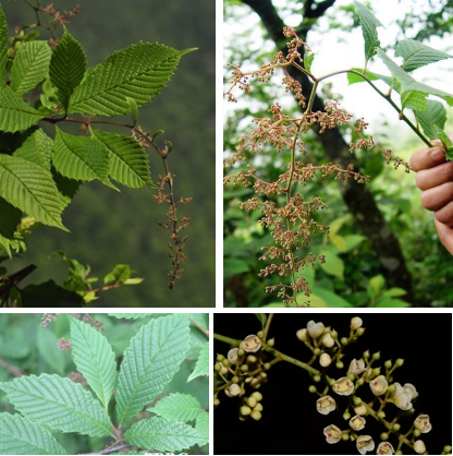 【识别要点】落叶小乔木,单叶,膜质,倒卵形或倒卵状椭圆形,先端渐尖或骤狭渐尖,边缘具疏离、侧脉伸出成凸尖的粗锯齿。圆锥花序顶生,向下弯垂;花白色,外面3片花瓣近圆形,裂片顶端有缘毛;果近卵形。花期5-6月,果期7-9月。
