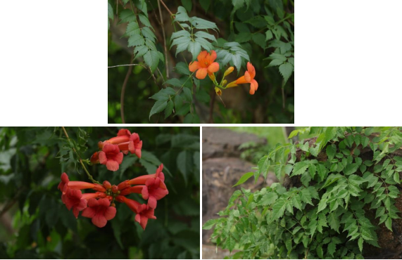 【识别要点】多年生攀援藤本,茎木质,表皮脱落,枯褐色,以气生根攀附于它物之上;叶对生,为奇数羽状复叶,小叶7-9枚,两面无毛。顶生疏散的短圆锥花序,花萼钟状,花冠内面鲜红色,外面橙黄色,裂片半圆形。蒴果细长如豆荚。花期5-8月。