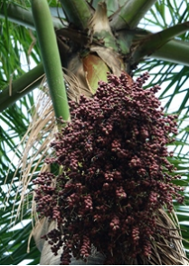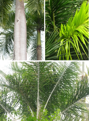 【识别要点】常绿乔木,树高达20m,树干光滑,有环纹,幼时基部膨大,后中下部渐膨大。羽状复叶长达3-4m,羽片常排为4列,基部外折;小叶条状披针形,长60-90cm,宽2.5-4.5cm,软革质,基部外折;叶鞘包干,绿色光滑。圆锥花序初时斜举,开花结果后下垂。果近球形,熟时红褐色至紫黑色;种子卵形。