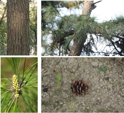 【识别要点】常绿乔木。树皮红褐色,不规则片状裂。一年生小枝淡黄褐色,轮生。叶2针一束。球果长卵形,有短柄,熟时栗褐色脱落。球花期4月,球果期翌年10-12月。