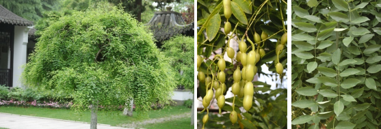 【识别要点】落叶乔木,羽状复叶长达25cm;叶轴初被疏柔毛,旋即脱净;托叶形状多变,有时呈卵形,叶状,有时线形或钻状,早落;小叶4-7对,对生或近互生,纸质,卵状披针形或卵状长圆形;圆锥花序顶生,常呈金字塔形,荚果串珠状,花期7-8月,果期8-10月。