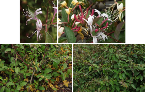 【识别要点】金银花的变种。落叶灌木,高可达2.5m,小枝纤细,叶片纸质,叶下面无毛或疏生短柔毛。花生于幼枝基部叶腋,芳香,总花梗极短,花冠淡紫色或紫红色,筒状钟形。果实红色,种子淡褐色。5-8月开花,8-10月结果。