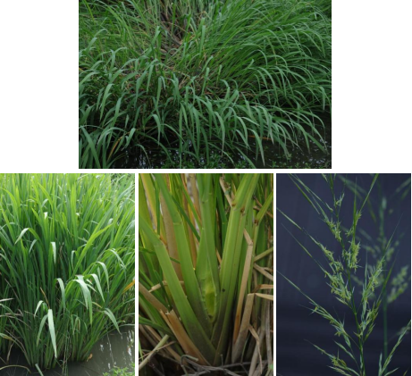 【识别要点】多年生草本水生宿根植物。地上茎是短缩状,部分埋入土中,其上发生多数分蘖;地下茎为匍匐茎,横生于土中越冬,其先端数芽次年春萌生新株。叶鞘肥厚,长于节间,自地面向上层层左右互相抱合,形成假茎;叶片扁平而宽广,表面粗糙,背面较光滑。圆锥花序大型,分枝多簇生,开花时上举。颖果圆柱形,花、果期秋季。