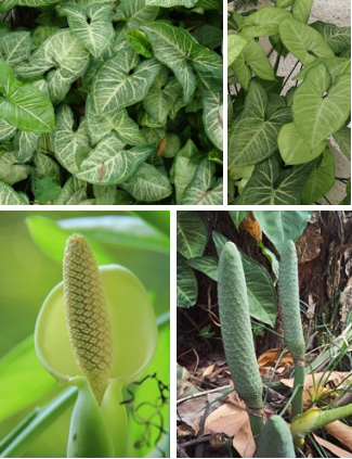 【识别要点】多年生常绿草本植物,合果芋的茎节具气生根,攀附他物生长。叶片呈两型性,箭形或戟形。叶基裂片两侧常着生小型耳状叶片。佛焰苞浅绿或黄色。合果芋一般不易开花。