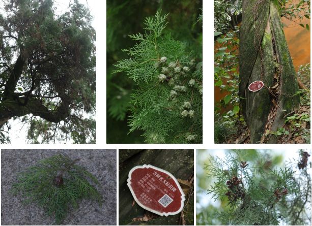 【识别要点】常绿乔木,幼树树冠卵状尖塔形,老树为广圆形。树皮薄片状剥离。大枝斜伸,小枝直展,扁平。叶全为鳞片状。雌雄同株,球花单生小枝顶端。球果卵形,熟前绿色,肉质,种鳞顶端有反曲尖头,熟后开裂,种鳞红褐色。球花期3-4月,球果期10-11月。