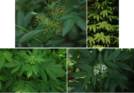 【识别要点】高大草本或半灌木,茎有棱条,羽状复叶,小叶互生或对生,狭卵形,边缘具细锯齿。复伞形花序顶生,大而疏散,花冠白色,花药黄色或紫色。果实红色,近圆形,表面有小疣状突起。4-5月开花,8-9月结果。