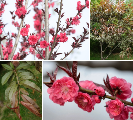 【识别要点】桃的变型。落叶乔木,树桃冠宽广而平展;树皮暗红褐色,老时粗糙呈鳞片状;具大量小皮孔。叶片紫红色,长圆披针形,先端渐尖,基部宽楔形,上面无毛,下面在脉腋间具少数短柔毛或无毛,叶边具细锯齿或粗锯齿,嫩叶紫红色。花单生,先于叶开放,花色有红色、粉红色后渐变为紫色或近绿色:花有单瓣、重瓣,果实小,无食用价值。花期3-4月,果期8-9月。