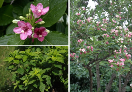 【识别要点】落叶灌木。小枝粗壮,叶沿中脉及侧脉被平贴毛。聚伞花序,萼筒长柱形,花萼裂片狭线形,基部完全分离,花冠大而色艳,初淡红色,后变深红色或带紫色,漏斗状钟形。蒴果。4-5月开花,8-10月结果。