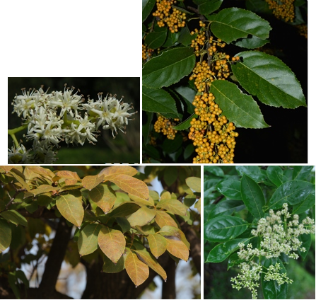 【识别要点】落叶乔木,干皮灰黑色纵裂。花两性,顶生或腋生圆锥花序,有疏毛,花小无柄,密集,花冠白色,有5裂片,雄蕊伸出花冠外,花萼钟状,绿色,5浅裂,缘具白毛,核果,近球形,橘红色,熟后黑褐色,花期4月,果熟7月。