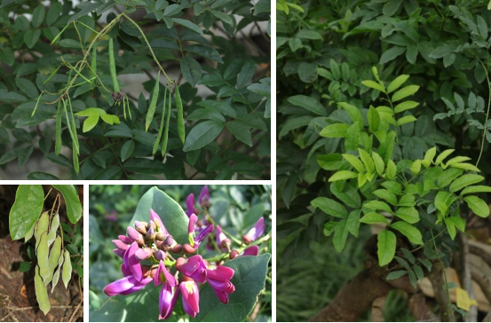【识别要点】落叶木质藤木,性状茎呈圆柱形,直径约3cm。表面灰黄色,粗糙,具横向环纹,皮孔椭圆形至长椭圆形,横向开裂。茎攀援,奇数羽状复叶互生,小叶7-9,长椭圆形或卵状椭圆形,长3-10cm。花紫或深红色,圆锥花序顶生或着生枝梢叶腋,下垂,花期5-8月。荚果长条形,10-11月成熟。