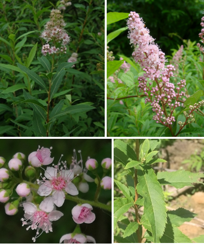 【识别要点】直立灌木,高1-2m;枝条密集,小枝稍有稜角,黄褐色,叶片长圆披针形至披针形,先端急尖,基部楔形,边缘密生锐锯齿。圆锥花序,花瓣卵形,先端通常圆钝,粉红色,蓇葖果直立。花期6-8月,果期8-9月。
