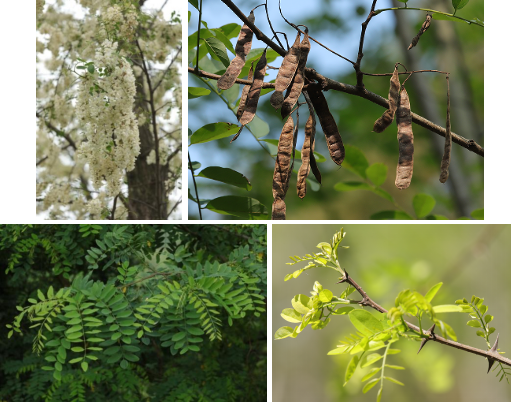 【识别要点】落叶乔木,高10-25m;树皮灰褐色至黑褐色。小枝灰褐色,幼时有棱脊,微被毛,后无毛;具托叶刺,长达2cm。羽状复叶长10-25cm;叶轴上面具沟槽。总状花序花序腋生,荚果褐色,或具红褐色斑纹,线状长圆形。花期4-6月,果期8-9月。
