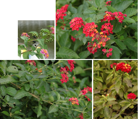 【识别要点】直立或蔓性的灌木,高1-2m,有时藤状,全株被短毛,有强烈气味。叶对生,卵形或心脏形。由多数小花密集成半球形头状花序;花色多变,初开时为黄色或粉红色,继而变为桔黄或桔红色,最后呈红色。花期5-10月。