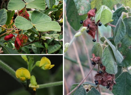 【识别要点】缠绕草质藤本植物。全株柔毛;茎略具棱。叶片为羽状或有时近指状;托叶小,披针形,小叶纸质,顶生小叶菱形或倒卵状菱形,常有小凸尖,基部圆形或阔楔形。总状花序;花排列稍密集;花萼钟状,裂片披针形,花冠黄色,荚果长圆形,红紫色,种子椭圆形或近肾形,黑色,光亮。5-8月开花,9-12月结果。