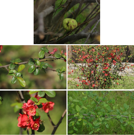 【识别要点】落叶灌木,小枝圆柱形,微屈曲,无毛;冬芽三角卵形,先端急尖,紫褐色。花先叶开放,3-5朵簇生于二年生老枝上,花梗短粗。果实球形,黄色或带黄绿色,有稀疏不显明斑点,味芳香;萼片脱落,果梗短或近于无梗。花期3-5月,果期9-10月。