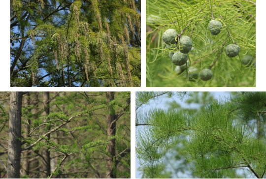 【识别要点】落叶乔木,树冠尖塔形。树干基部膨大,常具膝状呼吸根。树皮褐色,长条状剥落。大枝向上伸展,二年生枝褐红色,当年生小枝常略向下弯垂。叶多钻形略扁,螺旋状互生,贴近小枝。球果圆球形或长圆状球形,有短柄,熟时褐黄色。球花期3-4月,球果期10月。