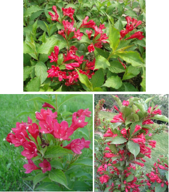 【识别要点】锦带花栽培品种,花1-4朵成聚伞花序,生于叶腋或枝顶,披针形,下半部连合,花冠漏斗状钟形,鲜红色。蒴果柱形,种子无翅。花期5-6月,10月果熟。