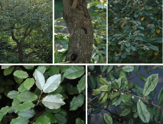 【识别要点】常绿灌木,枝开展,被褐色鳞片,具枝刺。叶革质,边缘微翻卷或微波状,背面有银白色及褐色鳞片。花银白色,芳香,1-3朵腋生,下垂。果椭圆形,被锈褐色鳞片,熟时棕红色。花期9-12月,果期翌年4-6月。有金边、银边、金心的变种。