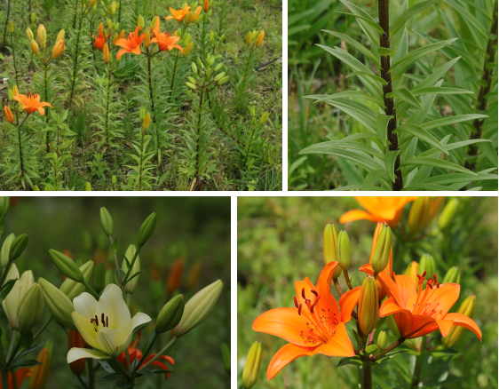 【识别要点】多年生球根花卉。株高60-120cm。鳞茎扁球形,黄白色。茎直立,被紫晕。叶着生茎中部以上,愈向上越明显变小,上部叶苞片状,披针形。花平伸,喇叭形,1-4朵,花药褐红色,花柱极长;花被乳白色,背面中脉带紫褐色纵条纹,味芳香,蜜腺两侧有小乳突状突起,花丝中部以下密被柔毛,花期5-6月。