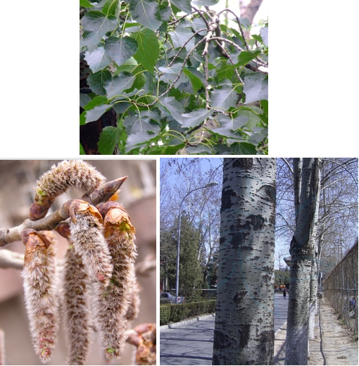 【识别要点】落叶乔木,高达30m。树皮幼时暗灰色,壮时灰绿色,渐变为灰白色,老时基部黑灰色,纵裂,粗糙,皮孔菱形散生,树冠圆锥形至卵圆形或圆形。长枝叶阔卵形或三角状卵形,先端短渐尖,基部心形或截形,边缘深齿牙缘或波状齿牙缘。短枝叶通常较小,具深波状齿牙缘。蒴果圆锥形或长卵形,花期3月,果期4-5月。