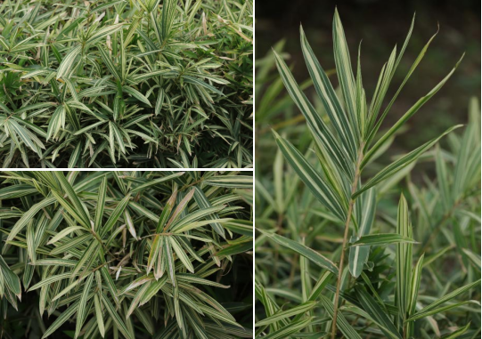 【识别要点】混生竹,低矮竹类,秆每节具2至数分枝或下部为1分枝。叶片狭披针形,边缘有纤毛,有明显的小横脉;叶鞘淡绿色,一侧边缘有明显纤毛,鞘口有数条白缘毛。叶面上有白色或淡黄色纵条纹,菲白竹即由此得名。