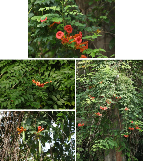【识别要点】与凌霄相比,小叶9-11枚,被毛。花冠橘红色,较小。
