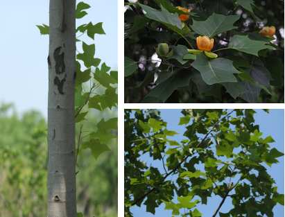 【识别要点】鹅掌楸与北美鹅掌楸的杂交种,落叶乔木,高达60m,主干通直,叶形似马褂,先端略凹,具4裂片,两中裂片长小于宽,近似北美鹅掌楸,叶背面白粉点小,近似中国鹅掌楸。花期5-6月,花较大,黄色,具清香,单生枝顶,形似郁金香。聚合果纺锤形,由多个长翅的小坚果组成,10月成熟,自花托脱落。