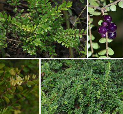 【识别要点】常绿灌木,小枝细长,横展生长。叶对生,细小,卵形至卵状椭圆形,革质,全缘,上面亮绿色,下面淡绿色。花腋生,并列着生两朵花,花冠管状,淡黄色,具清香,浆果蓝紫色。花期4-6月,果熟期9-10月。