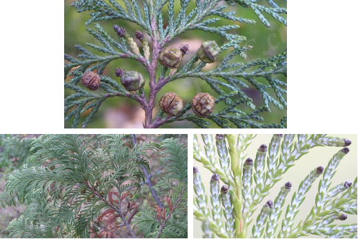 【识别要点】常绿乔木,树冠圆锥形。树皮红褐色,裂成薄片。生鳞叶的小枝背面有白线或微被白粉。鳞叶先端钝,肥厚。雌雄同株,球花单生枝端。花期4月;球果10-11月成熟。