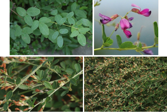 【识别要点】直立灌木,分枝多、卵状叶片,花冠为红紫色。荚果斜卵形。花期8月,果熟期9-10月。