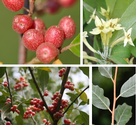 【识别要点】落叶直立灌木,小枝甚开展,多分枝,幼枝密被银白色和少数黄褐色鳞片,有时全被深褐色或锈色鳞片,老枝鳞片脱落,灰黑色;芽银白色或褐色至锈色。叶纸质或膜质,椭圆形至卵状椭圆形或倒卵状披针形,果实几球形或卵圆形,幼时绿色,被银白色或有时全被褐色鳞片,成熟时红色;果梗直立,花期4-5月,果期7-8月。