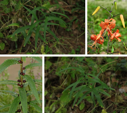 【识别要点】球根植物。鳞茎近宽球形,高约3.5cm,直径4-8cm;鳞片宽卵形,白色。茎高0.8-1.5m,带紫色条纹,具白色绵毛。叶散生,矩圆状披针形或披针形,两面近无毛,有5-7条脉。花下垂,花被片披针形,反卷,橙红色,有紫黑色斑点。蒴果狭长卵形,长3-4cm。花期7-8月,果期9-10月。
