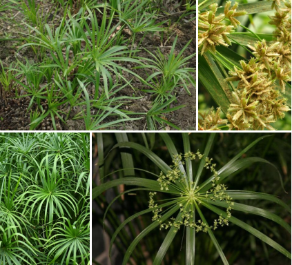 【识别要点】多年生丛生草本。株高60-120cm。杆直立,三棱形,无分枝。地下具短 根茎,粗壮。叶退化成鞘状,棕色,包裹在茎杆基部。总苞片叶状,数枚伞状着生杆顶,带状披针形;小花序穗状,扁平,多数聚成大形复伞形花序,花期6-7月。